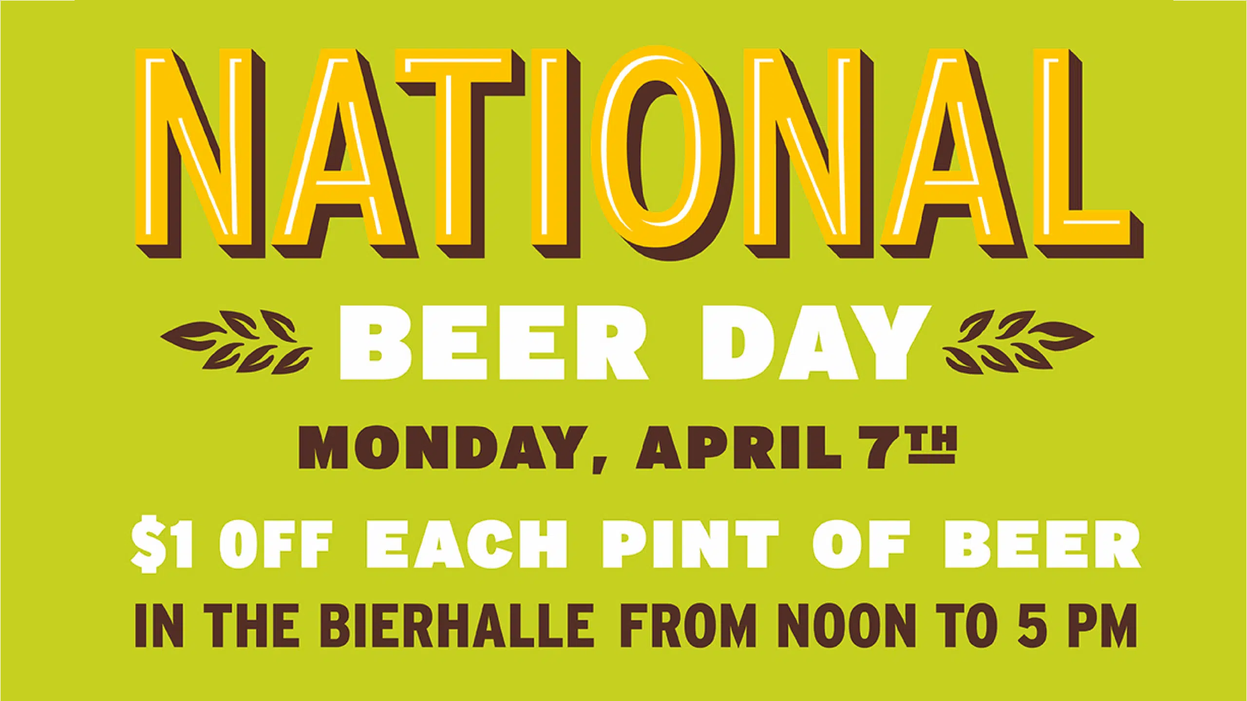 Join us at the Bierhalle on Monday, April 7th to celebrate National Beer Day! We’re offering $1 off every pint noon to 5PM. This day marks the 1933 signing of the Cullen-Harrison Act, which ended the prohibition on selling beer in the U.S.—a moment definitely worth toasting to!