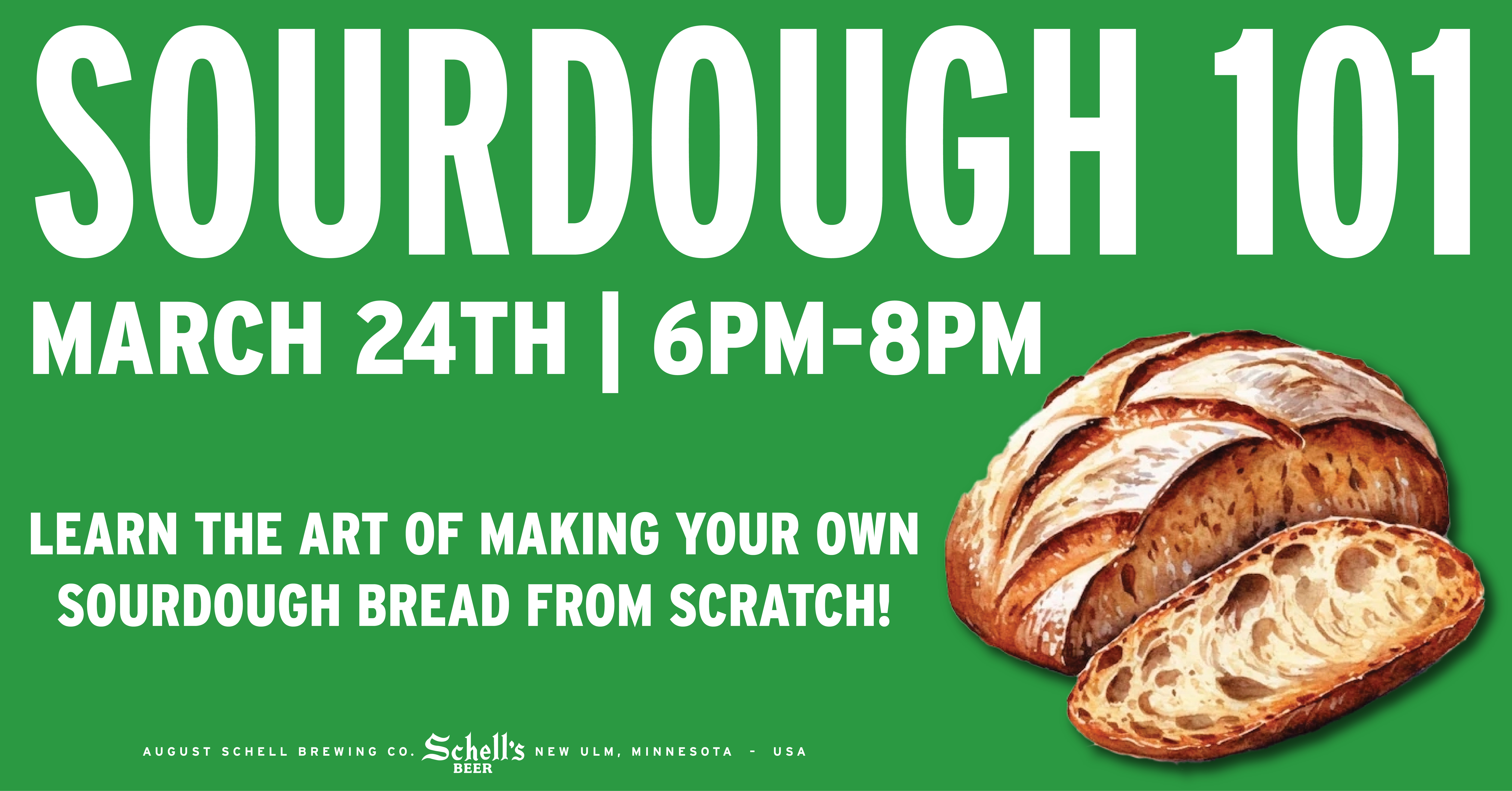 Join us for a fun and interactive sourdough workshop at Schell’s Brewery! You will leave class with dough to bake at home and a well established, 105 year old starter!