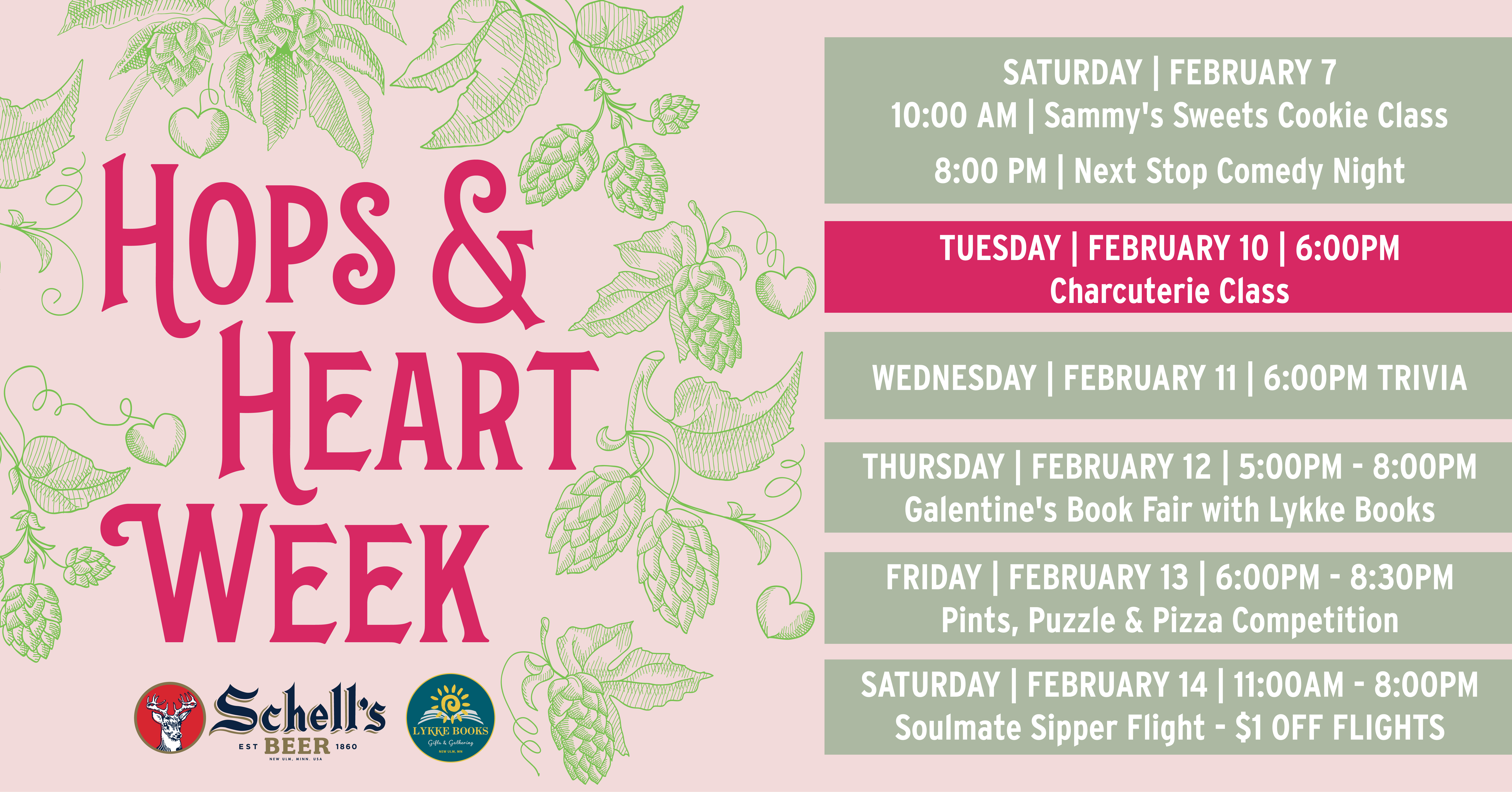 Grab your Valentine or Galentine and learn the art of creating a beautiful charcuterie board in this special Valentine Candlelight Charcuterie Workshop at Schell’s Brewery. You will learn food selection ideas, meat folding techniques, cheese styling, cheese, chocolate and beer pairings and so much more! Whats Included: A palm leaf plate, meat, cheeses, fruits, crackers,